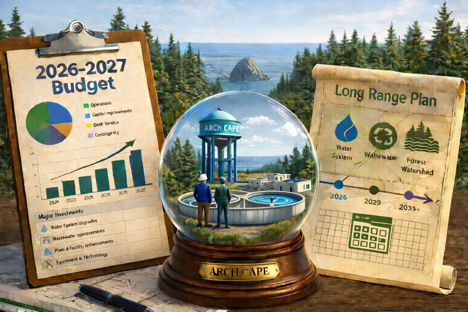 For the period July 1, 2024 – June 30, 2025, the County collected $603,361.71 in taxes from short term rental properties within the Arch Cape Water/Sanitary District area. Given recent State legislation (House Bill 4148) that was signed by Governor Kotek on April 7th of this year, as of January 1, 2027 $462,583 of that collected tax revenue could be spent on general services- infrastructure. From now on, it is more than likely that at least $603,361.71 in taxes will again be collected every year. As additional tax money is collected each year, additional revenue can be spent on general services – infrastructure. In. other words, more than $462,583 will be available each year and allowed to be spent on water and sanitary infrastructure.