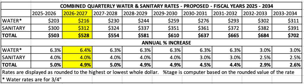 As anticipated last year, Water rates will increase this coming year by 6.4% from $203/quarter to $216/quarter. Sanitary rates will increase by 4.0% from $300/quarter to $312/ quarter. Combined increase is 4.9% from $503/quarter to $528/ quarter.